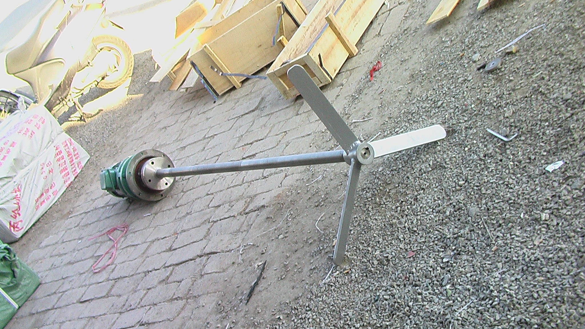 JBJ型桨式搅拌机如图所示,由搅拌轴、搅拌桨叶、机座和驱动装置等结构组成。当原水与混凝剂或助凝剂液体流经混合池时在搅拌机的排液作用下产生流动循环,使混凝药剂与水快速充分混合,以达到混凝工艺的要求。